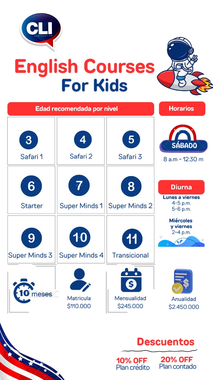 Nuestro curso de inglés para niños y niñas de primaria incentivará a tu hijo(a), entre 7 y 11 años, a expresarse en una segunda lengua como aprendió su lengua materna con un programa natural, donde solo se habla inglés y en el que los niños/niñas son protagonistas de su propio aprendizaje, al mismo tiempo que desarrollan sus competencias de hablar, leer, escribir y escuchar el idioma. Gracias a nuestro equipo instructores los niños desarrollan tanto sus habilidades en inglés, como el ser ya que nuestra visión es impactar vidas cada día.